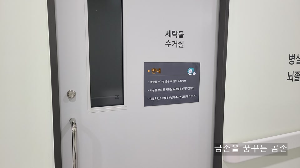환자복을 벗어서 세탁물 수거실에 넣었어요.