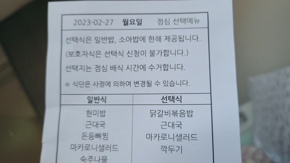 선택식 종이를 아침에 주고 가시네요. 내일 점심을 선택식으로 할지 일반식으로 할지.