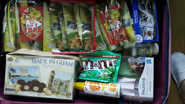 28인치 캐리어 반 칸이 괌에서 산 선물로 가득 찼어요. 선물을 더 샀으면 캐리어를 하나 더 장만해야 했을 듯해요.