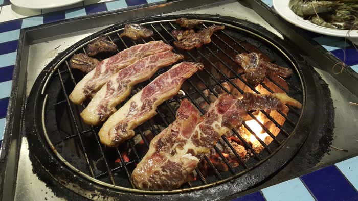 선셋바베큐에서 LA갈비와 생새우 위주로 먹었어요. 숯불에 구워 먹으니 맛은 있는데 연기가 많이 나서 자리 선택을 잘해야 해요. 바람의 방향을 고려해서 앉으세요.