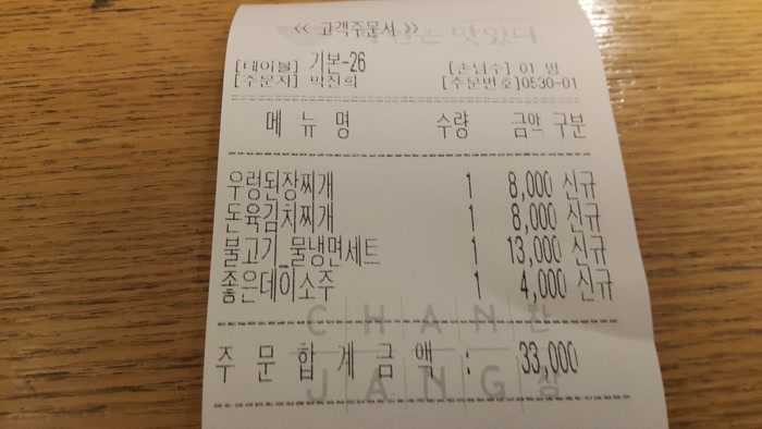 작년에는 불고기+냉면 세트, 우렁된장찌개, 해물순두부찌개, 소주 1명을 먹었어요.