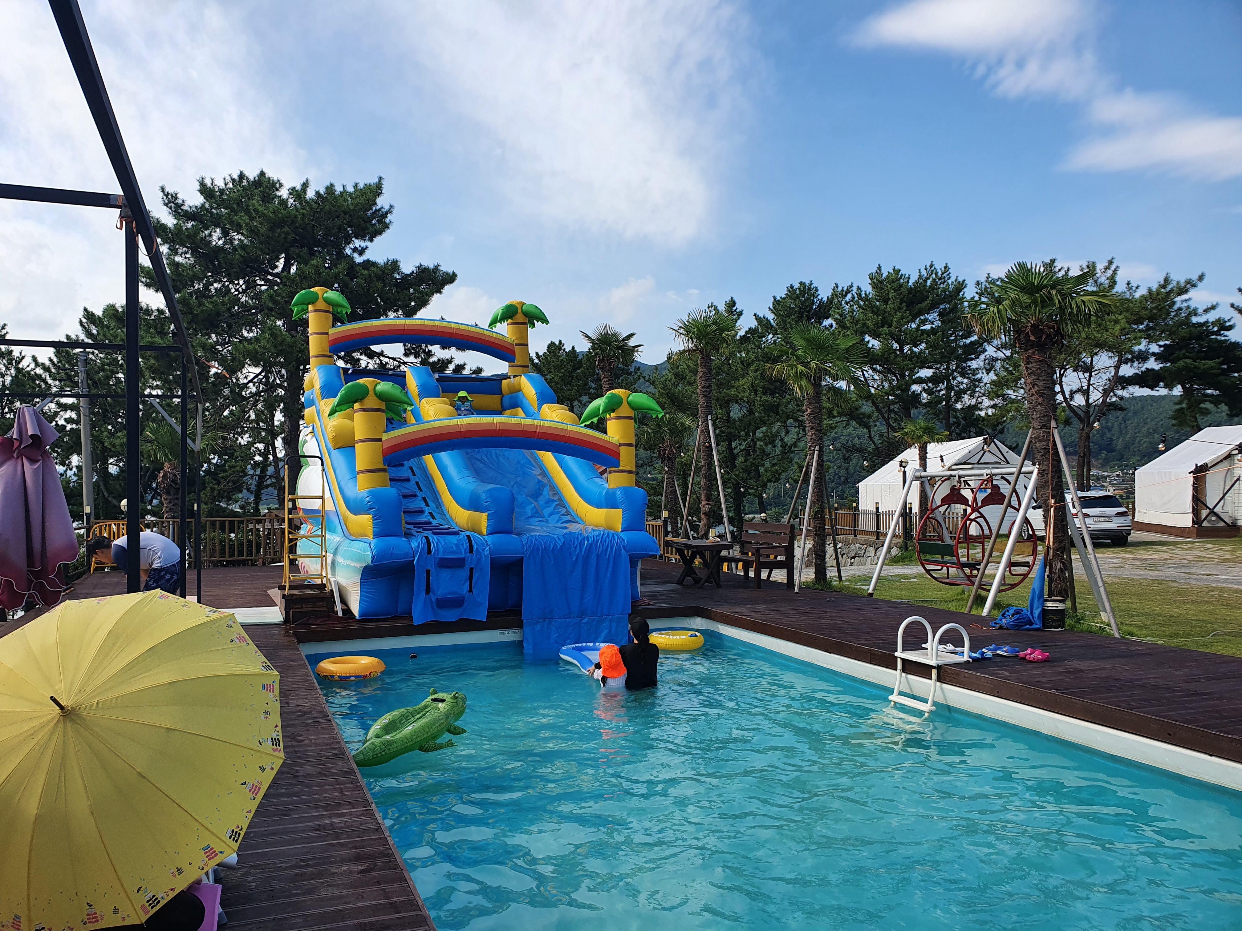 아이들이 좋아했던 것은 수영장이네요. 에어바운스가 되어 있어서 딸아이의 경우 에어바운스 미끄럼틀을 20번이나 탔어요. 발에 쥐가 날 정도로 열심히 놀았어요. 이렇게 논 것만으로도 본전을 다 뽑았어요.