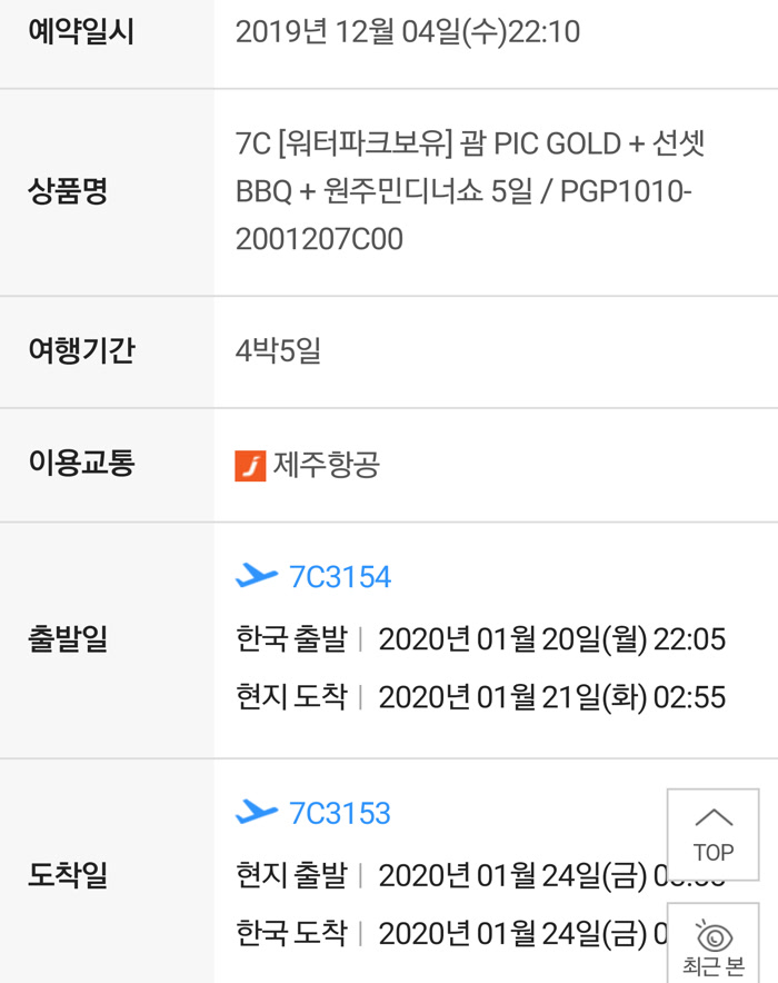 부산 출발로 김해공항에서 제주항공을 타고 괌 패키지로 가는 것이에요.
