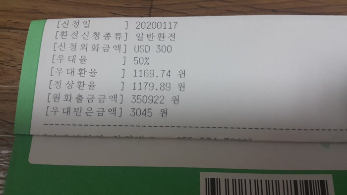 우대환율이 1169.74원으로 300불 환전에 35만원 정도이네요.