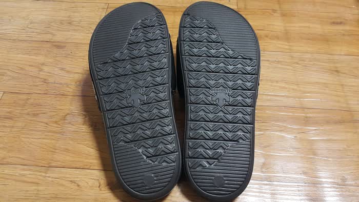 데상트 슬리퍼 남녀공용 듀얼 퓨터에센셜 슬라이드 바닥 모습이네요. 새 슬리퍼이다보니 미끄러질 염려는 없겠네요.