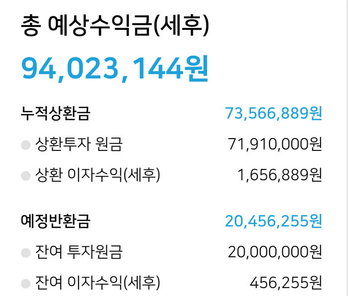 2018년부터 시작하다 보니 누적상환금은 73,566,889원으로 71,910,000원을 넣어서 1,656,889원의 세후 이자를 받았어요.