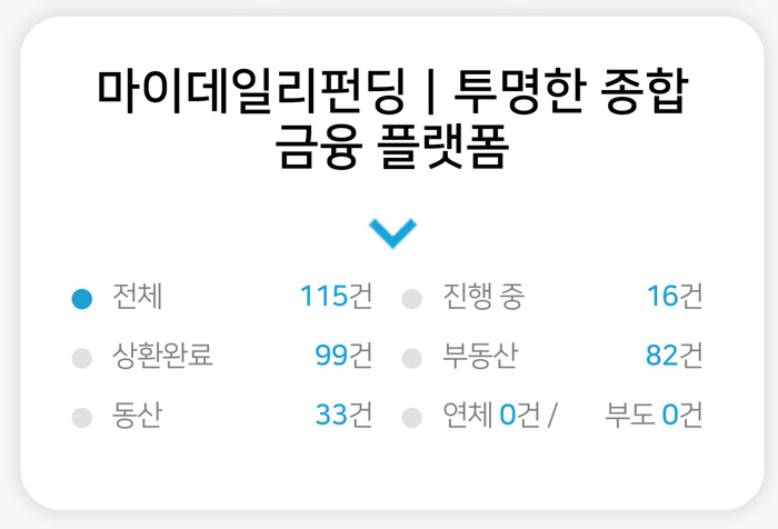 2018년 9월을 시작으로 데일리펀딩에는 115건을 넣었고 99건을 상환받았어요. 현재는 16건이 남아 있네요.