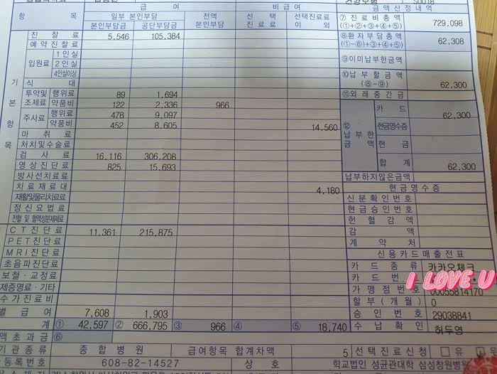 진료비 총액이 729,098원이네요. 엄청난 진료비이네요.