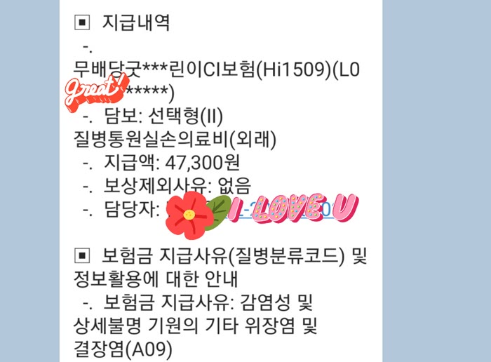 질병통원실손의료비로 지급액이 47,300원이네요. 대형병원이라 15,000원이 공제되고 다 나왔네요.