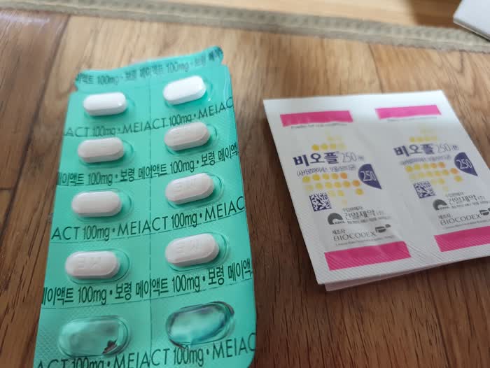 딸아이가 처방받은 약은 건일제약 비오플250산과 보령제약 메이액트MEIACT 100mg이네요. 약국에서 메이액드 100mg는 세다고 하던데... 마음이 아프네요.