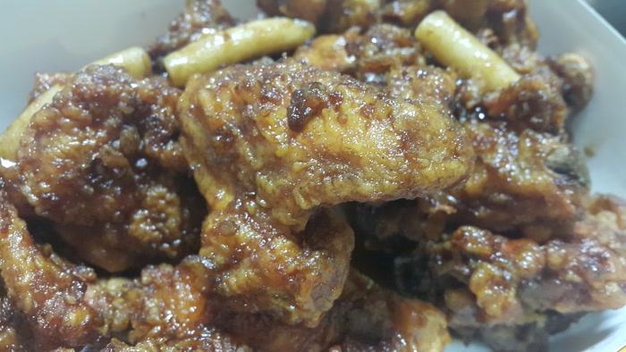 단짠윙봉은 간장소스에 떡볶이 떡, 치즈볼도 함께 있네요. 간장소스 맛은 달고 짭네요.