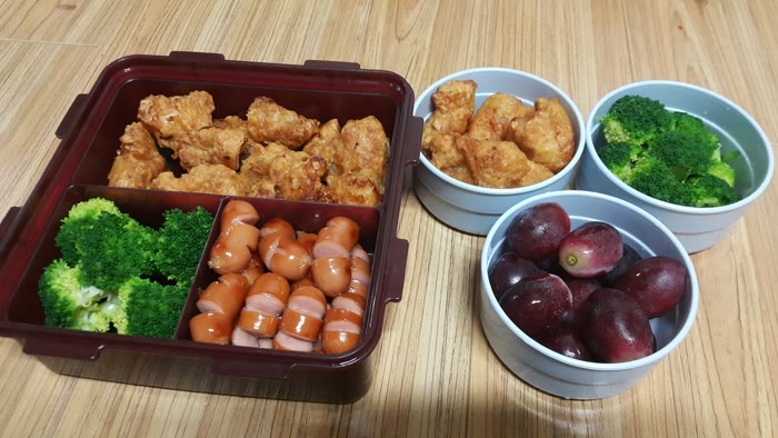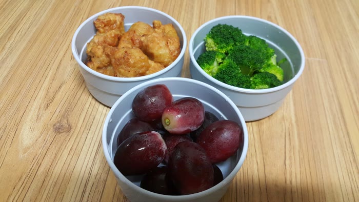 처음으로 넣은 반찬은 고메 치킨, 브로콜리, 포도이네요.