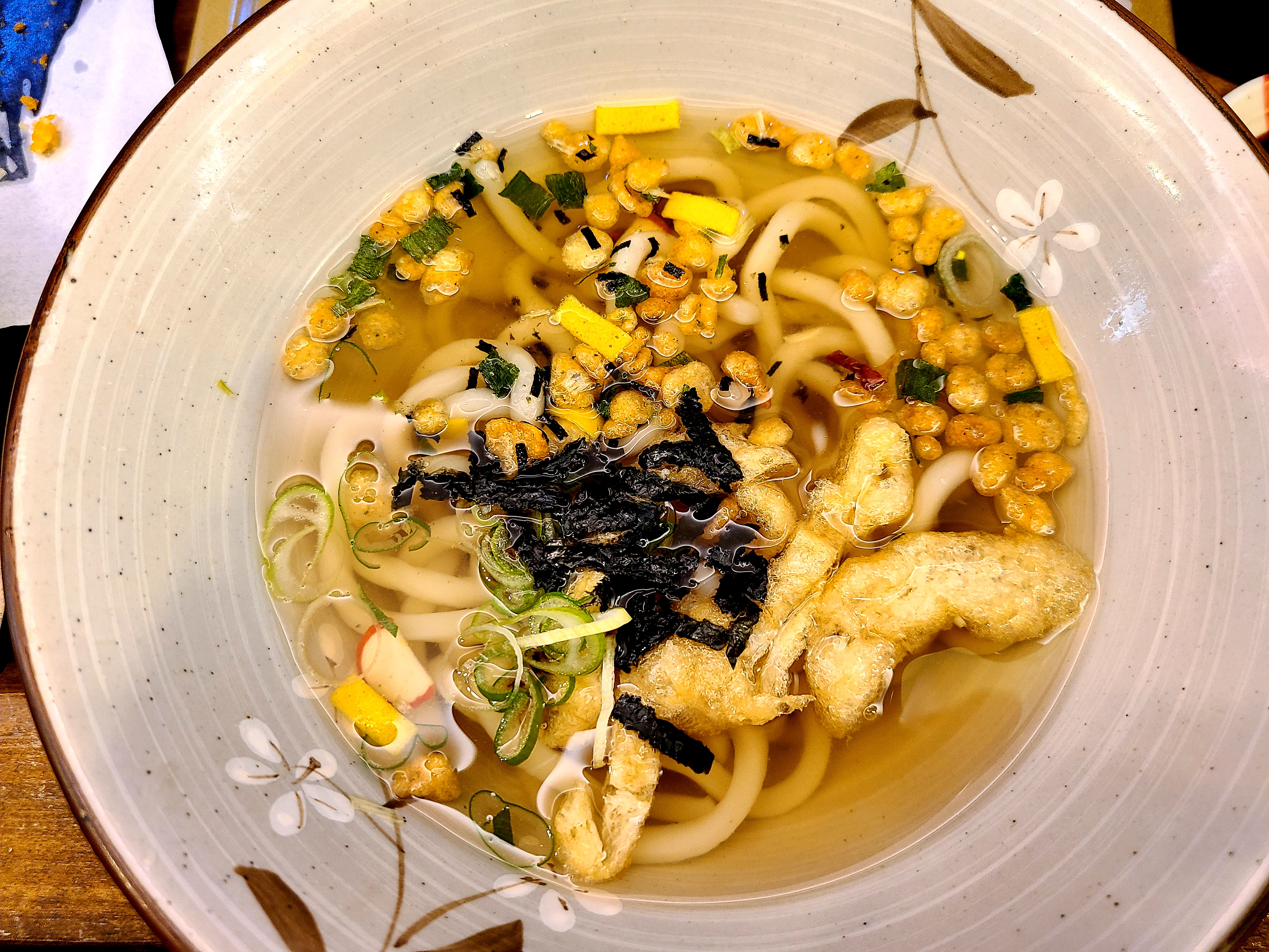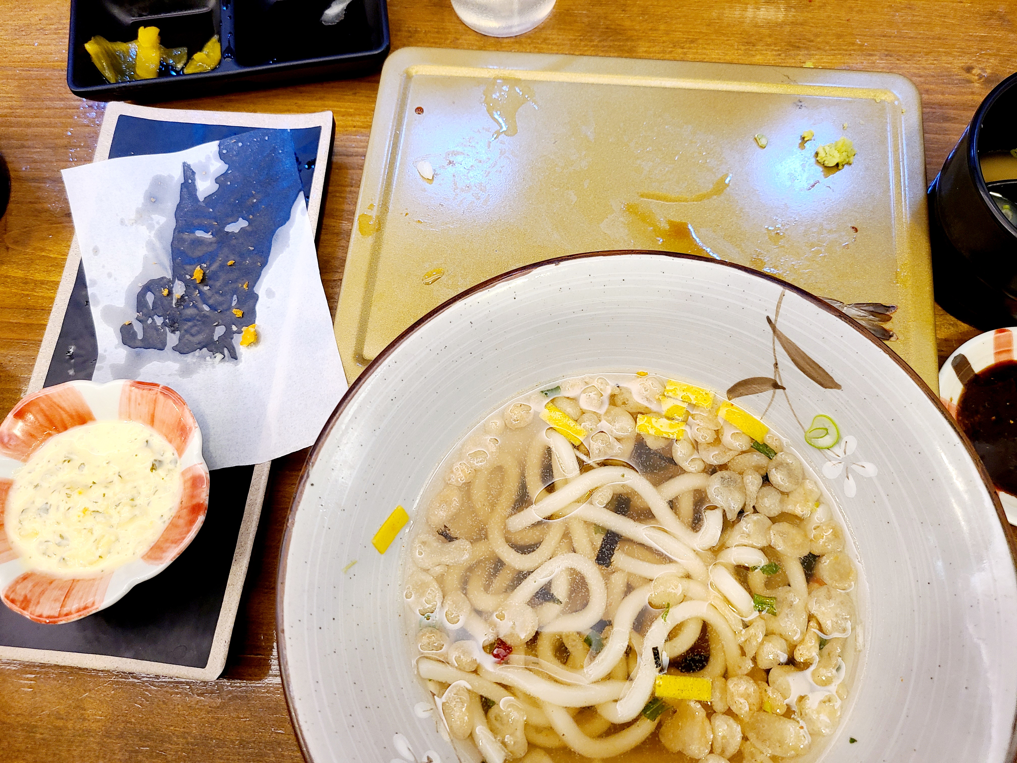 모둠스시와 왕새우 후라이가 끝인 줄 알았는데 우동 1인분이 나왔어요. 정말 우동 1인분 양이네요. 어떻게 이것을 다 먹어? 잘 먹으시는 분이 가시면 우동까지 끝내시지 않을까 싶어요. 남편도 잘 먹는 편인데 초밥12p에 왕새우 튀김을 먹고는 우동은 국물만 먹네요.