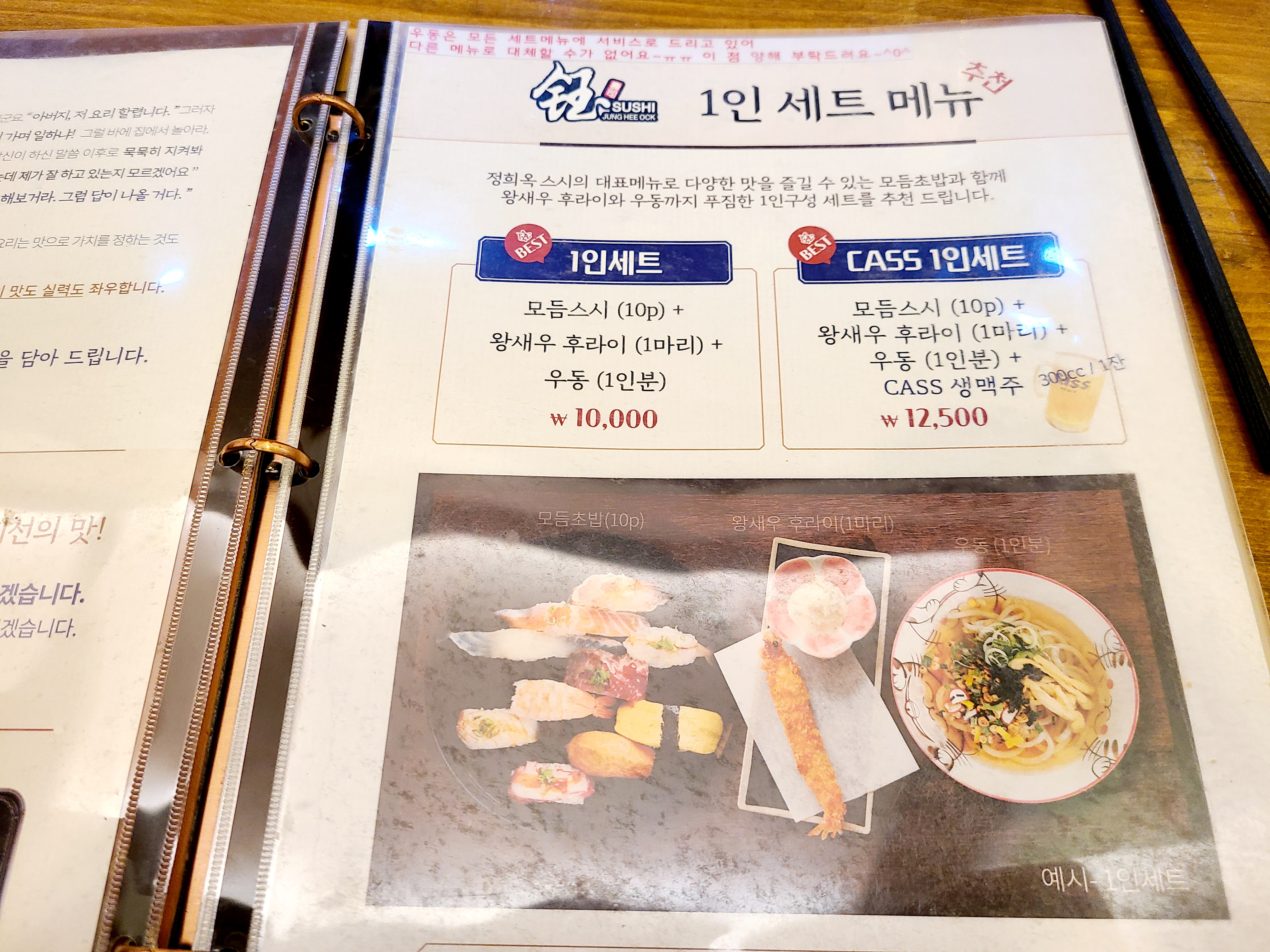 베스트 1인 세트는 모둠스시(10p)+왕새우 후라이(1마리)+우동(1인분)으로 10,000원이네요.