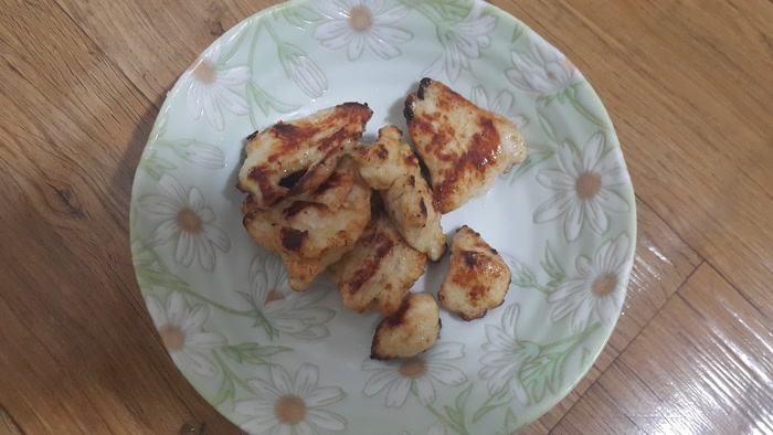 닭가슴살이라서 퍽퍽해서 기름이 안 나올 줄 알았는데 기름이 좀 나오네요. 식용유를 몇 방울 뿌렸는데. 식용유 없이 구워도 괜찮겠네요.