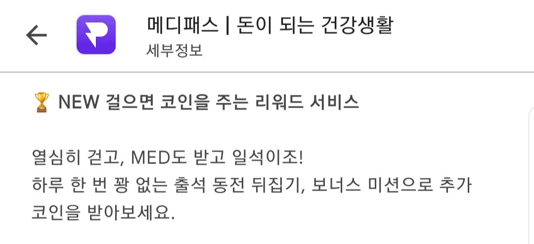 운동이 되는 앱입니다. MED를 받기 위해서 일부러 열심히 걷고 있습니다.