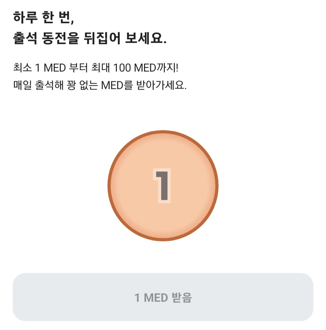 메디패스 코인워크에서 출석 동전 뒤집기를 하면 최소 1 MED부터 최대 100 MED까지 매일 출석해 꽝 없는 MED를 받을 수 있다고 합니다.