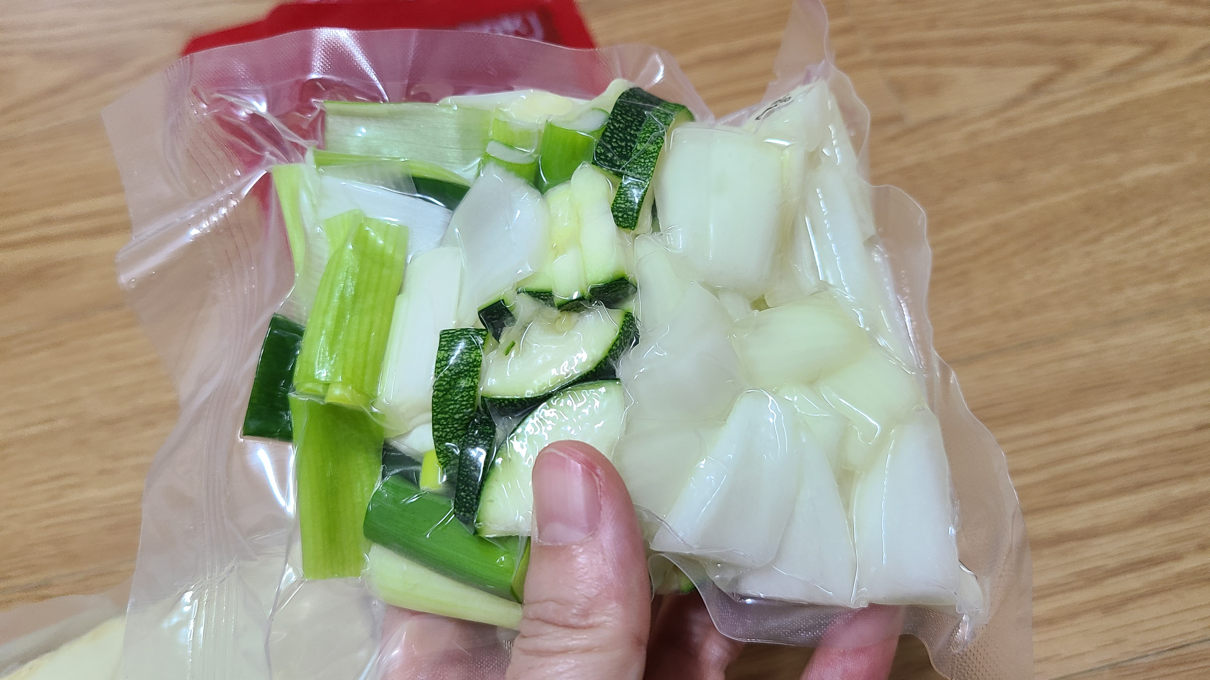 양파, 애호박, 파로 구성이 되어 있네요. 따로 사면 못 먹는 것이 많은데 야채가 이렇게 되어 있어서 편하네요.