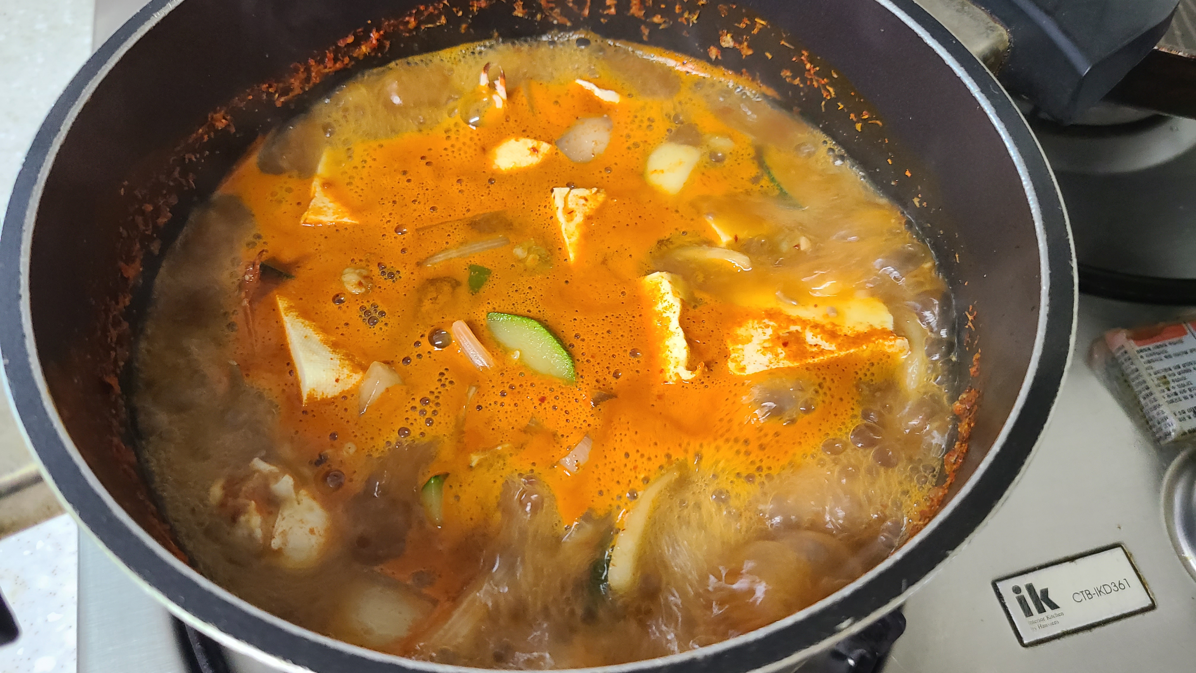 3. 팔팔 끓기 시작하면 중불로 바꾸고 두부를 올려 10-15분간 끓여준 후 완성합니다.