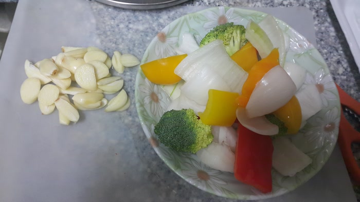 마늘은 편 썰기로 썰었어요. 편 썰기로 나온다면 칼 도마도 필요 없을 텐데.