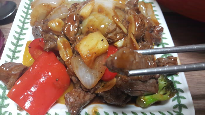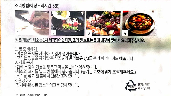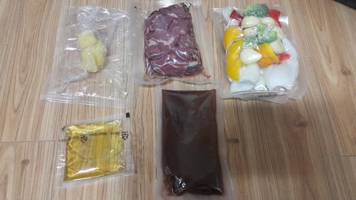 미국산 소고기, 손질된 야채, 파인애플, 올리브유, 소스가 들어있네요.