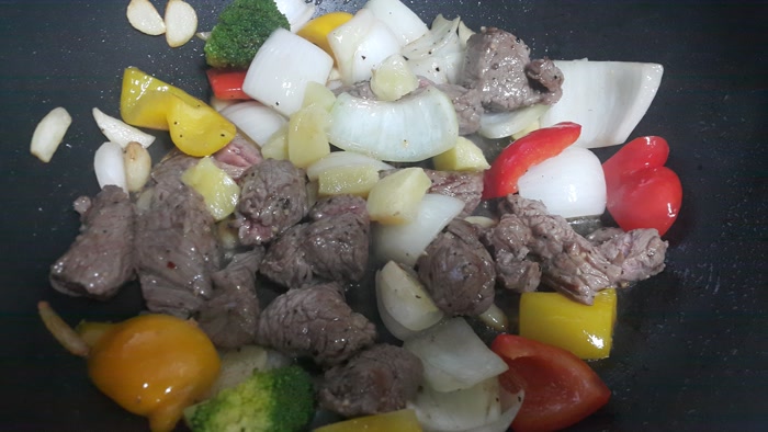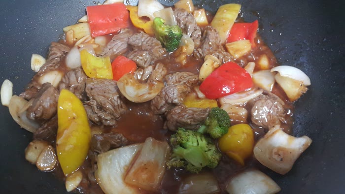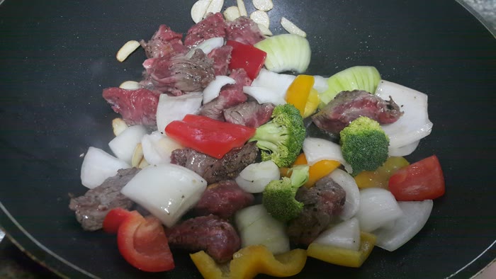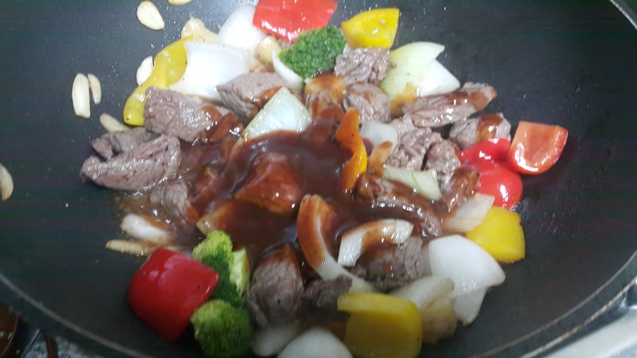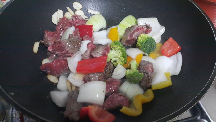 - 채소와 고기를 넣고 센 불에서 볶아줍니다.