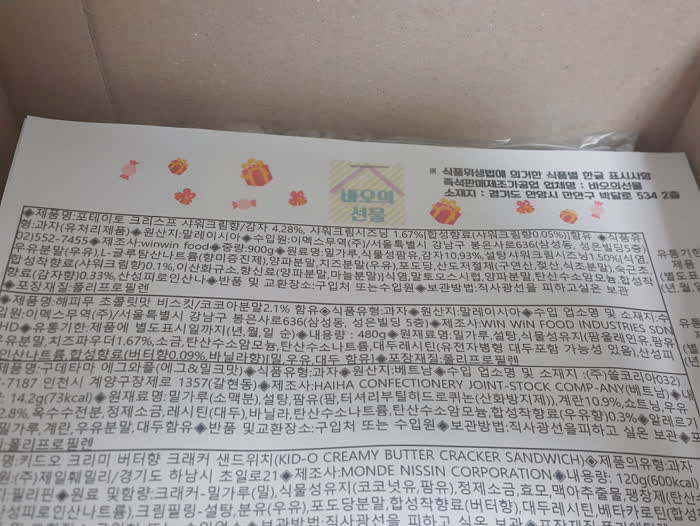 과자 제품별 내용량이 담긴 종이도 들어 있어요.