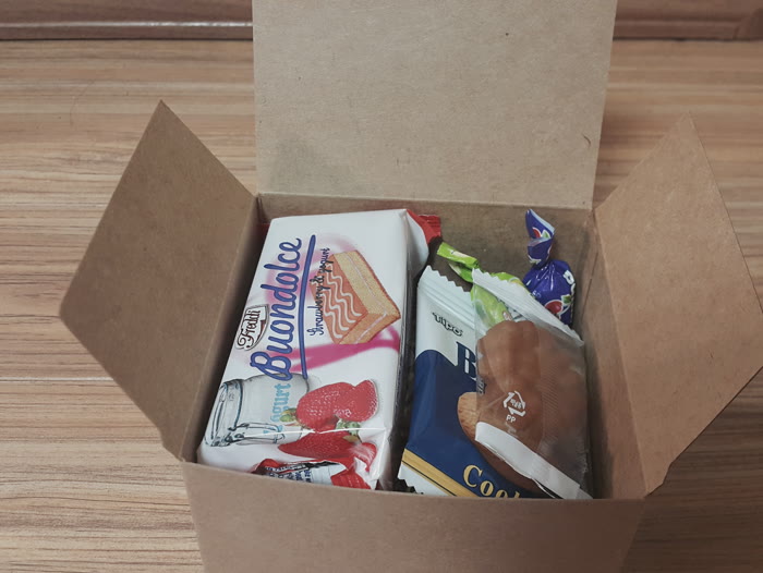 맞춤 스티커까지 붙어있는 과자 상자예요. 스티커까지 붙어있어서 바로 간식 선물로 주면 좋네요.