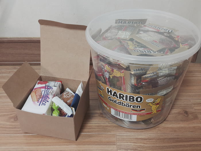 아이들이 하리보를 좋아해서 하리보 4개를 넣었더니 상자가 꽉 차네요.