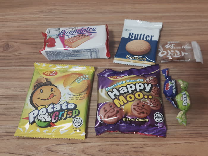과자의 종류는 부온돌체, 포테이토크리스피, 해피무, 티포, 담라소프트캔디, 쌀로 만든 미니약과가 1개씩 들어 있네요.