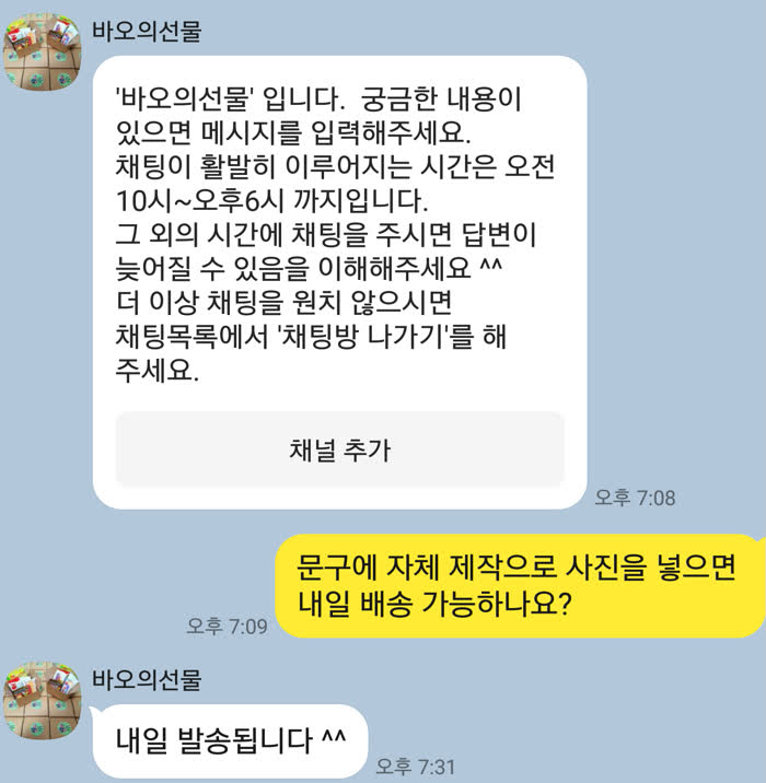 카카오톡 바오의 선물로 배송과 스티커 사진 제작을 문의드렸더니 바로 답이 오네요.