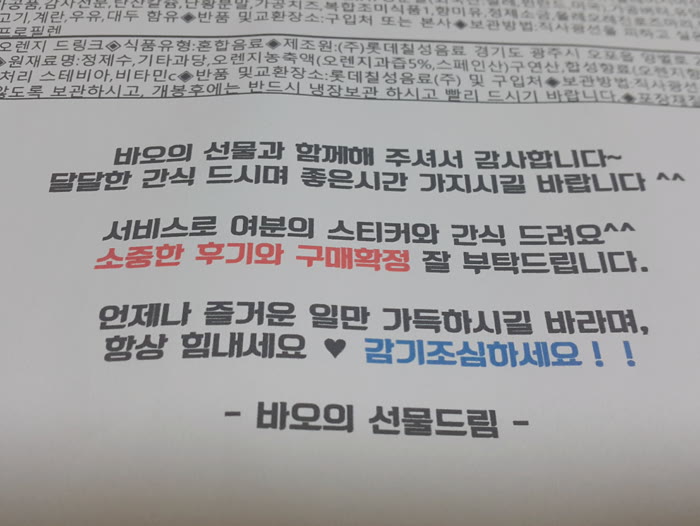 다음에도 간식 선물을 줄 일이 있으면 '바오의 선물'을 이용해야겠어요. 예쁘게 맞춤 스티커도 만들어서 특별한 선물로 주어야겠네요.