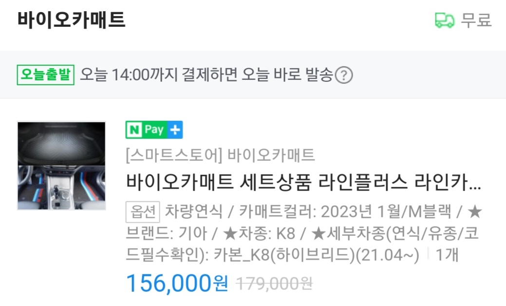 - 바이오카매트(1열+2열, 트렁크 매트 포함): 156,000원
