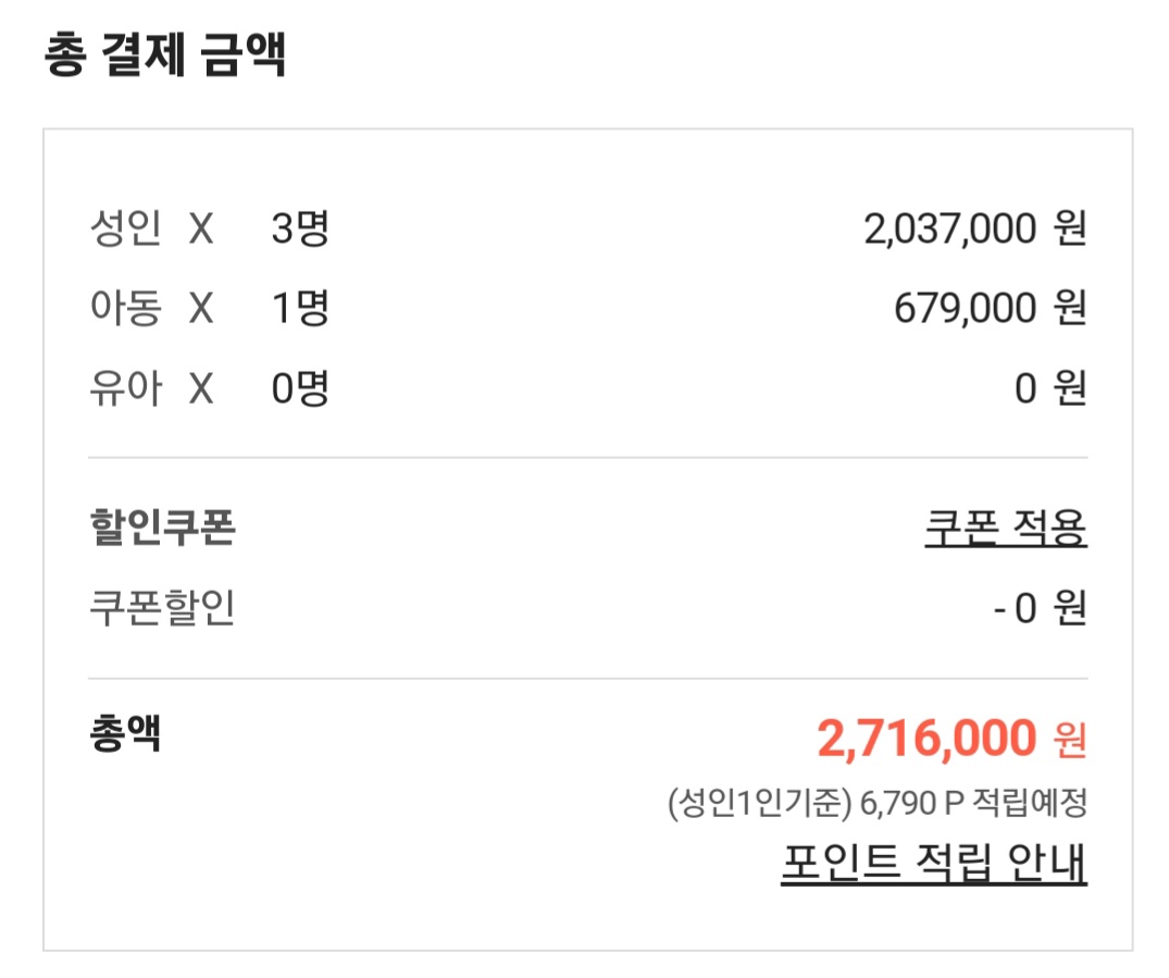 - 가격: 2,716,000원(성인 3명, 아동 1명/679,000원*4명 )