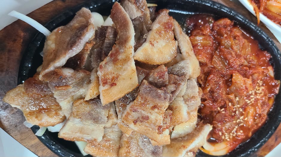 밑부분에 양파가 깔려있고, 구운 삼겹살과 볶음김치가 담겨져 있습니다.