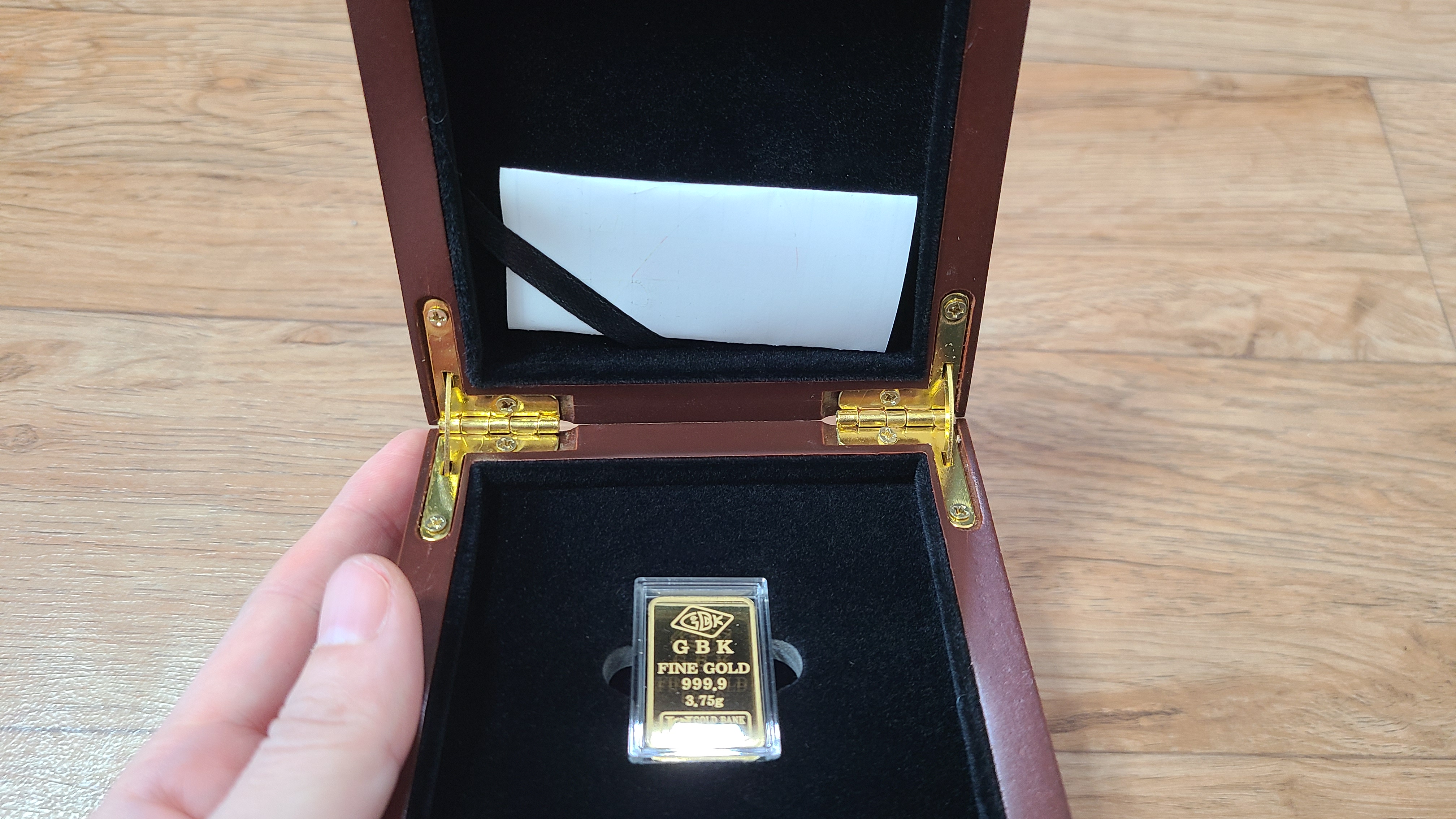 한 돈짜리 골드바에는 나무 케이스이네요. 융케이스도 나쁘지 않았는데 한 돈 미니골드바는 융케이스가 없고 나무케이스만 있었답니다.