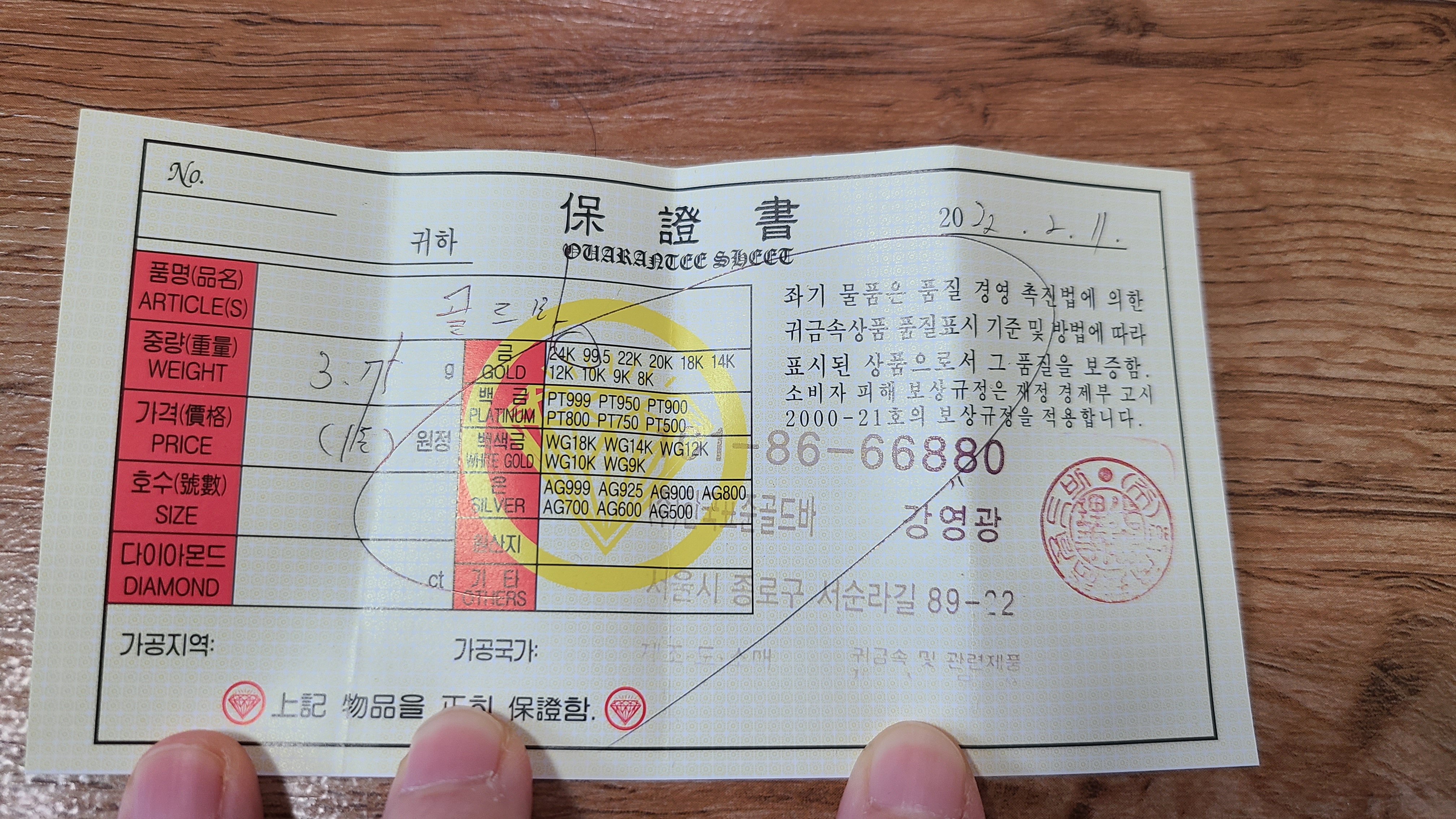 품질 보증서는 1g짜리가 더 예쁘네요.