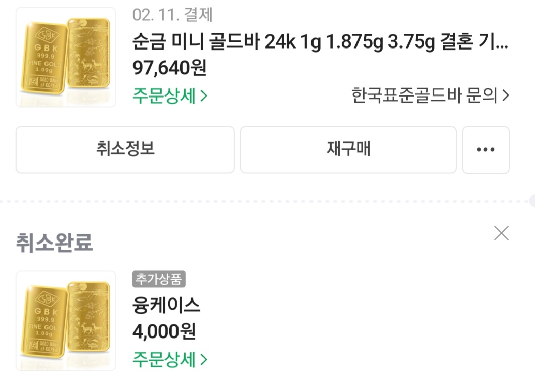 제가 골드바 1g을 살 때의 가격은 97,640원에 융 케이스 4,000원, 배송료 30,000원으로 104,640원이 들었어요.