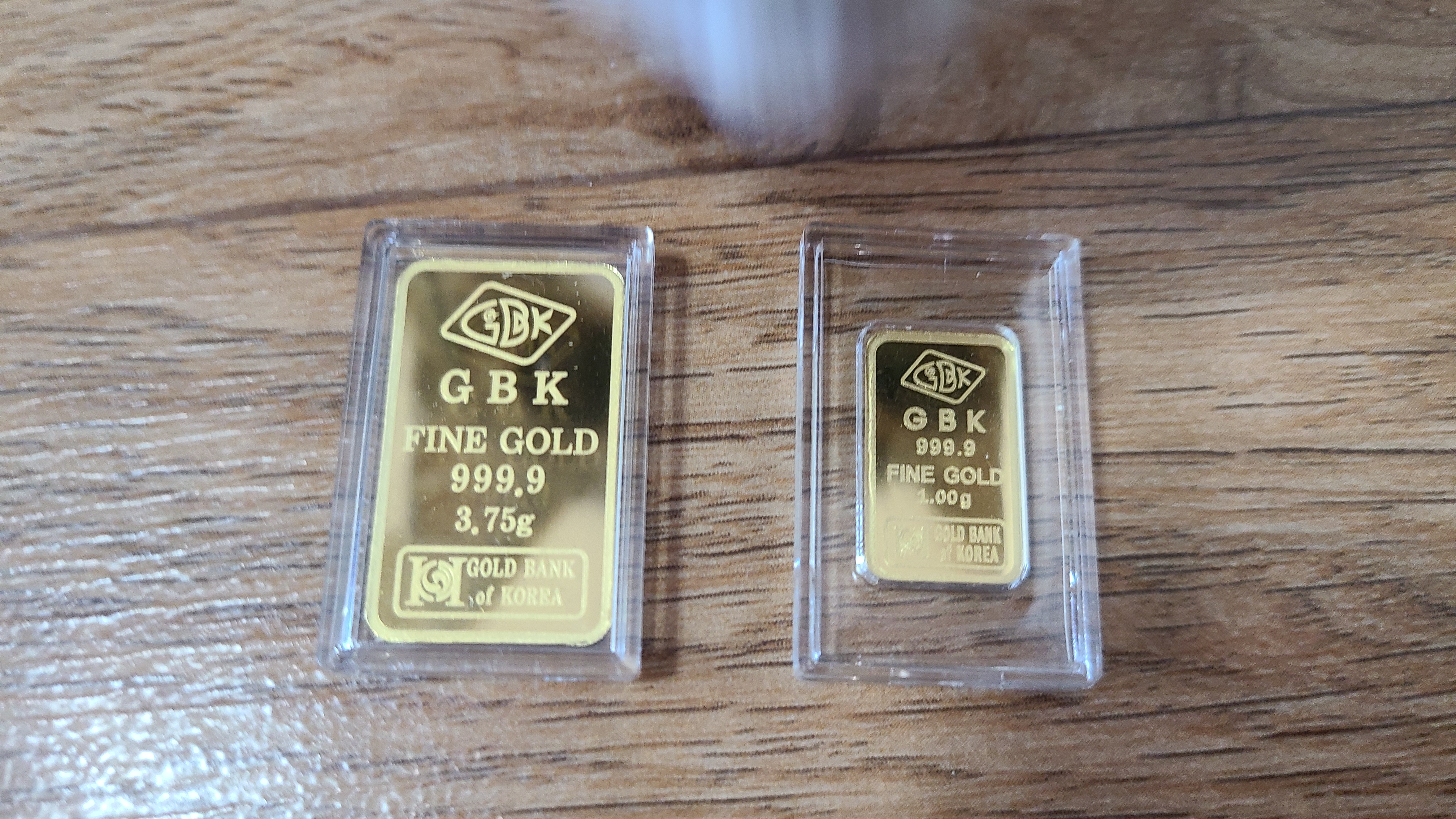 1g 미니골드바와 3.75g 미니골드바를 두 개 같이 놓아보았어요.