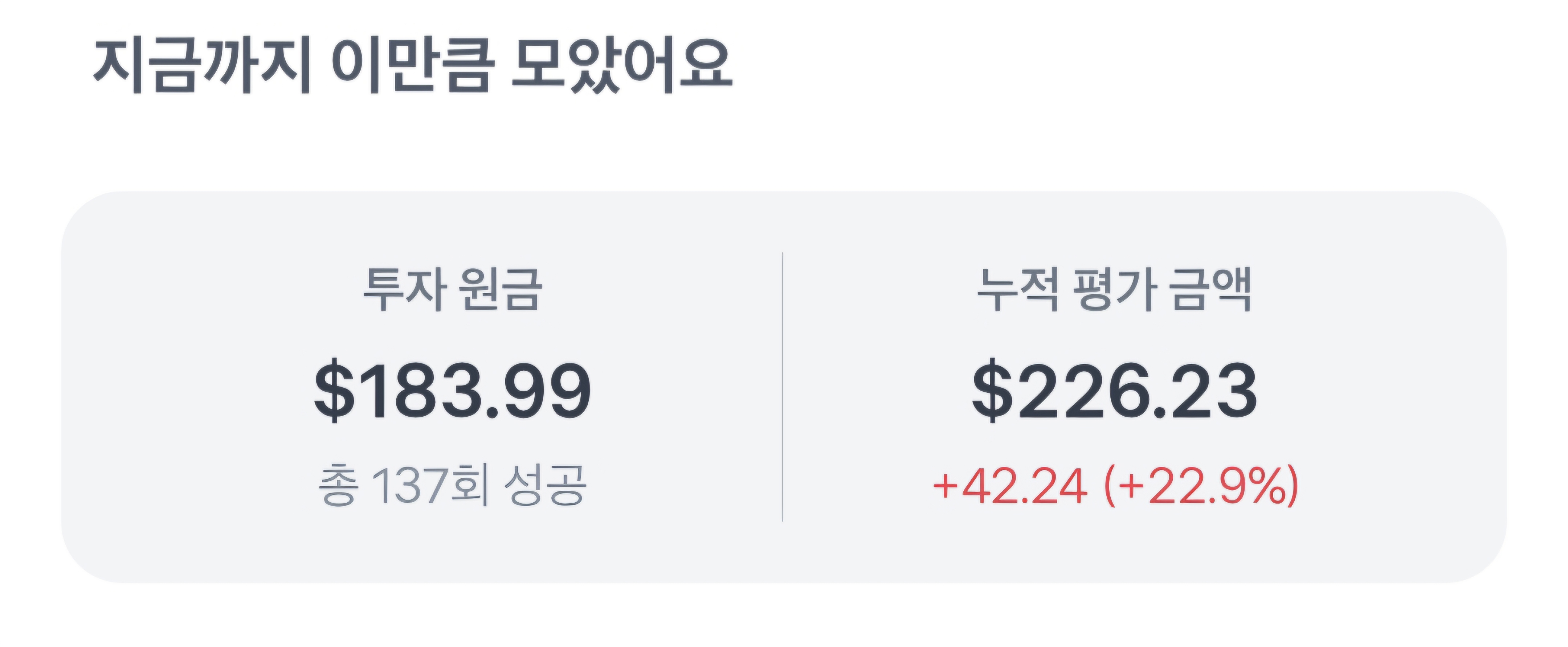 6월에 수익이 났는데 8월에도 수익이 났습니다. 소수점 투자 137회로 약 184달러를 넣었고, 누적 수익은 42.24달러로 22.9%의 수익입니다.