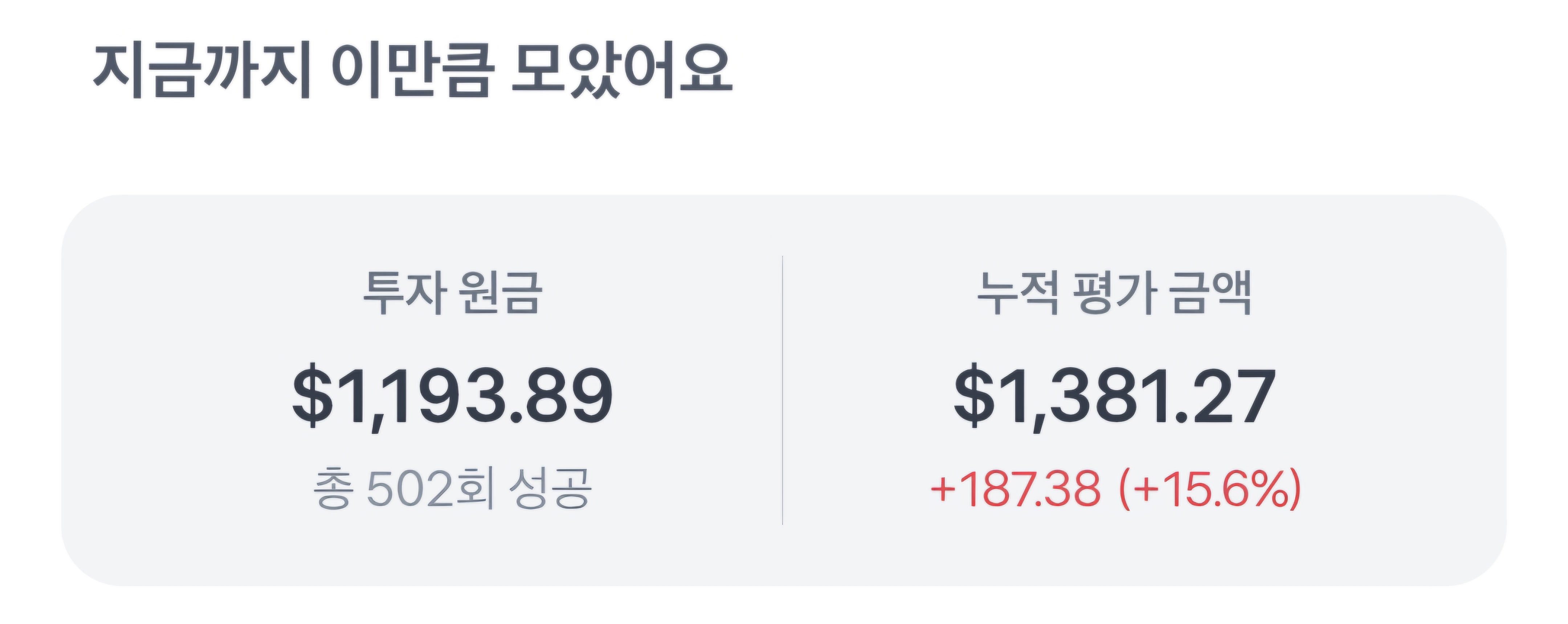 마이크로소프트 주식을 502회 소수점 투자를 하여 15.6%로 187.38달러의 수익이 났습니다.