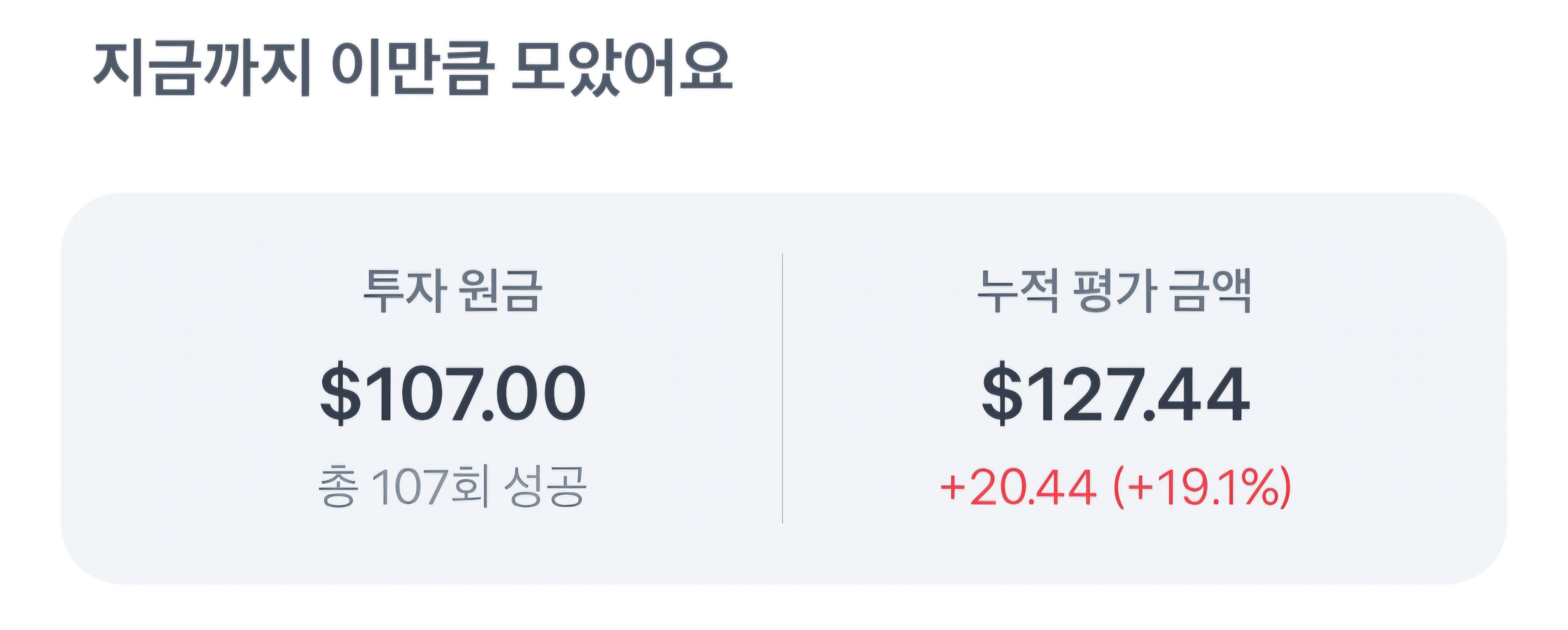 TSLL 주식 수익은 20.44달러로 19.1%입니다. 소수점 투자로 1달러씩 107회 성공하였습니다. 누적평가 금액은 127.44달러입니다.