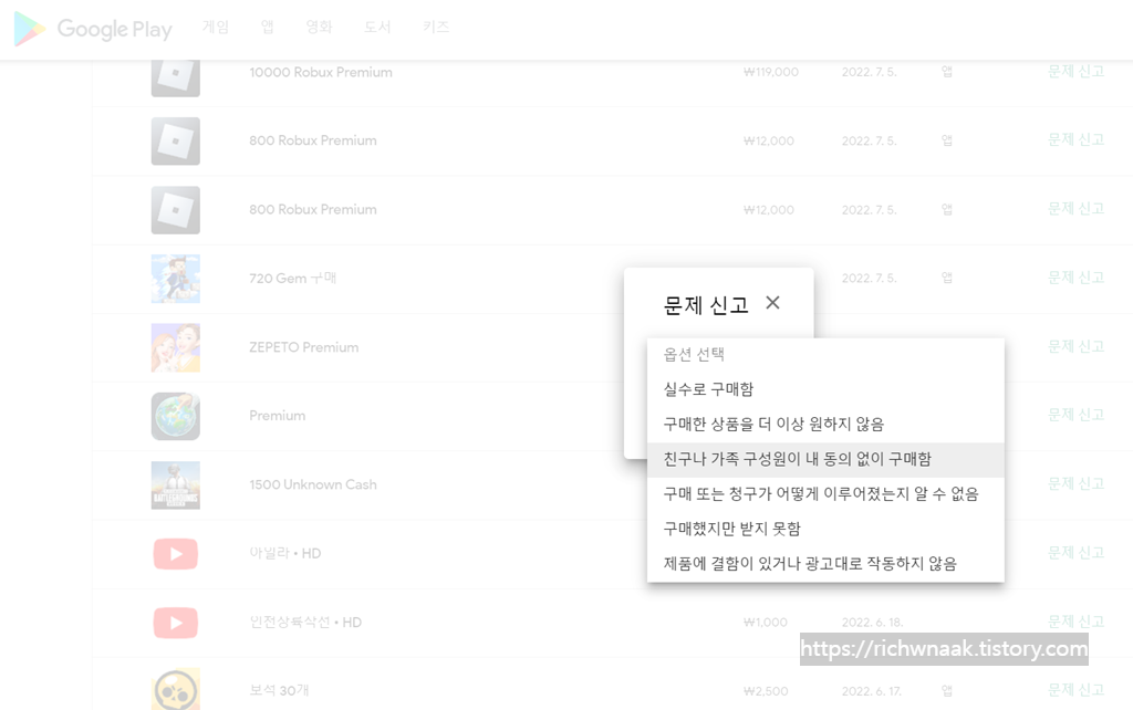 '친구나 가족 구성원이 내 동의 없이 구매함'을 선택했습니다.