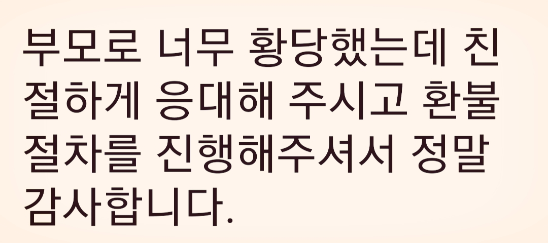 부모로 너무 황당했는데 친철하게 응대해 주시고 환불절차까지 진행해주셔서 정말 감사하다는 메일을 적었습니다.