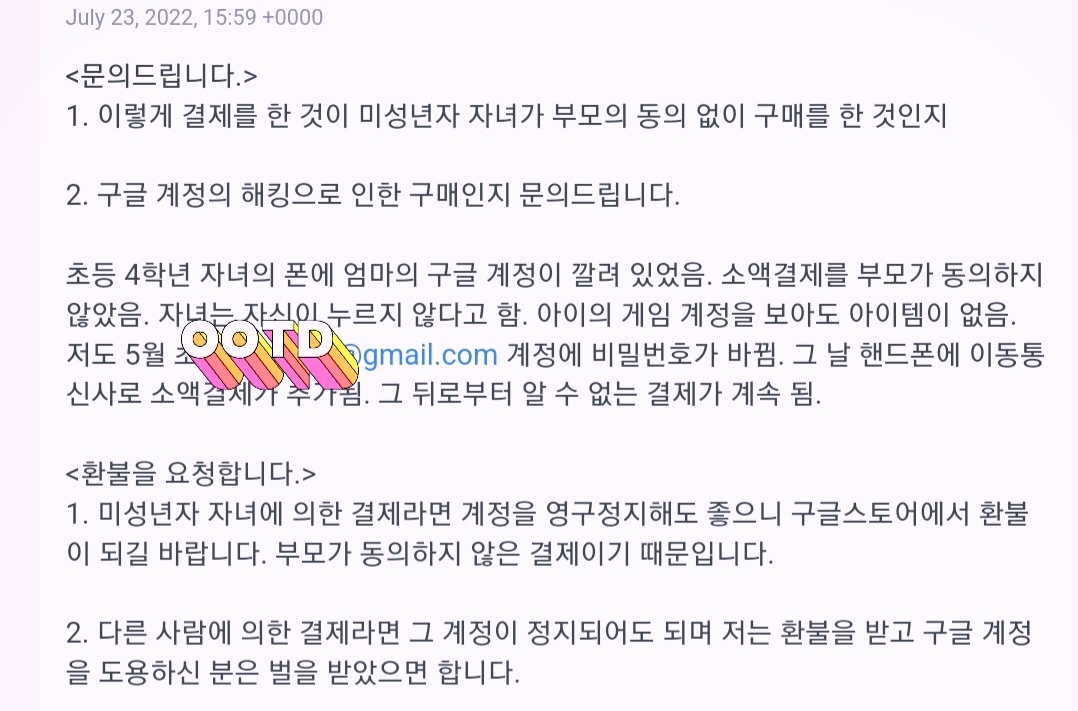 1. 만약 미성년자 자녀에 의한 결제라면 계정을 영구정지해도 좋으니 환불을 요청했습니다. 이는 부모가 동의하지 않은 결제이기 때문입니다.