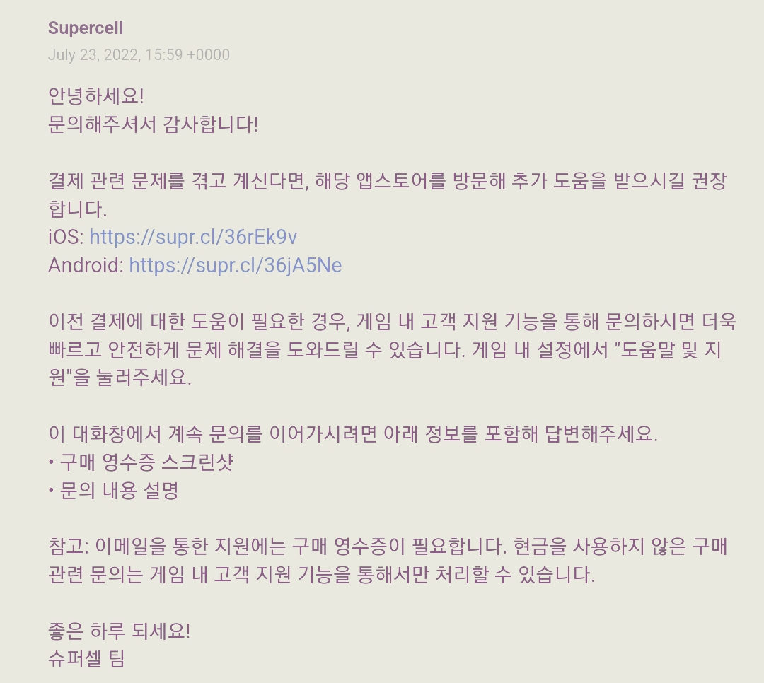 슈퍼셀 고객지원센터에서 마지막 메일을 받았습니다.