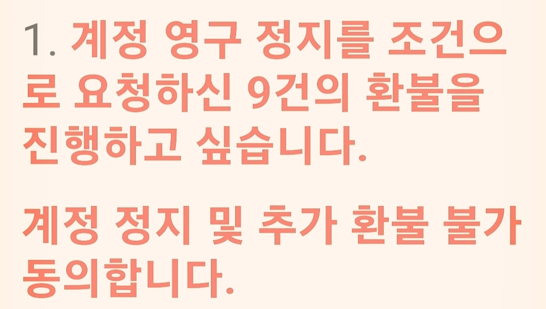 1. 계정 영구 정지를 조건으로 요청하신 7건의 환불을 진행하는 방법입니다. 계정 정지는 추가로 같은 문제가 발생하는 것을 방지하기 위함이며, 정지 이후 계정의 복구나 추가 환불이 어려운 점 유의해주세요. 이에 동의하신다면 "계정 정지 및 추가 환불 불가 동의합니다." 라고 보내주세요.
