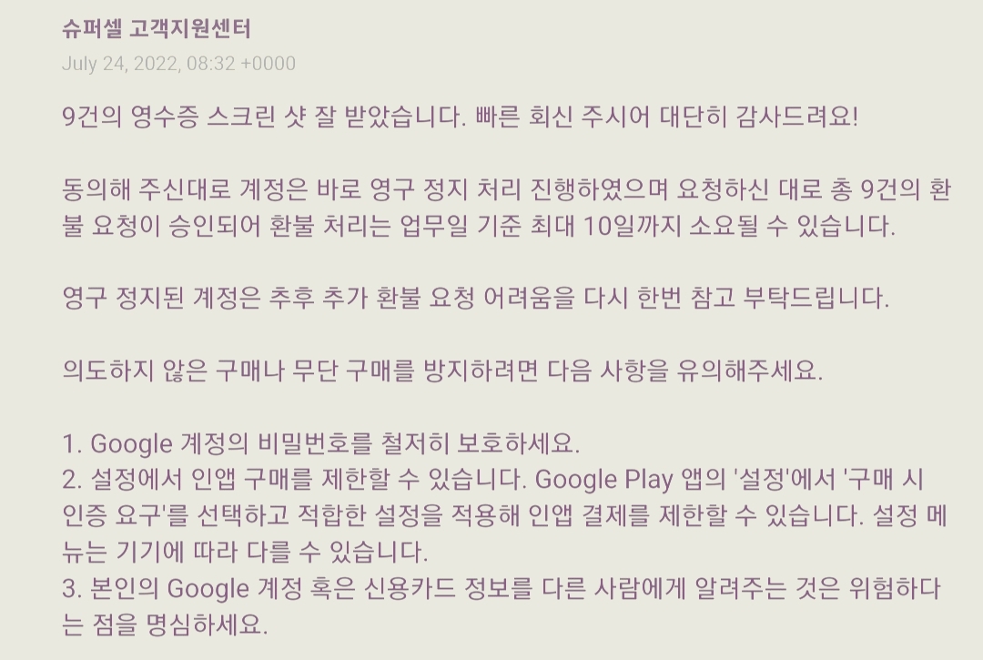 저에게 법을 이야기하는 것이 아니라 다양한 방법의 환불 선택 기회를 주시고 간단한 구매 영수증으로 모든 환불을 진행해주신 슈퍼셀 고객센터.