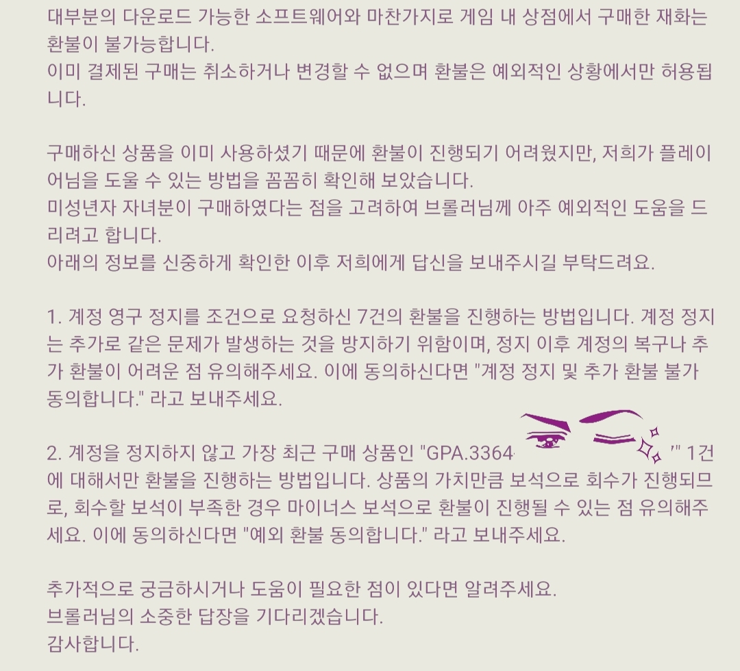 미성년자 자녀분이 구매하였다는 점을 고려하여 브롤러님께 아주 예외적인 도움을 드리려고 합니다.