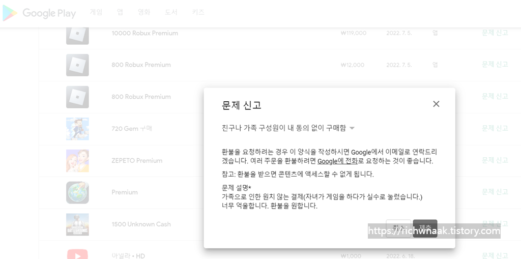 가족으로 인한 원치않는 결제(자녀가 게임을 하다가 실수로 눌렀습니다. 너무 억울합니다. 환불을 원합니다.)